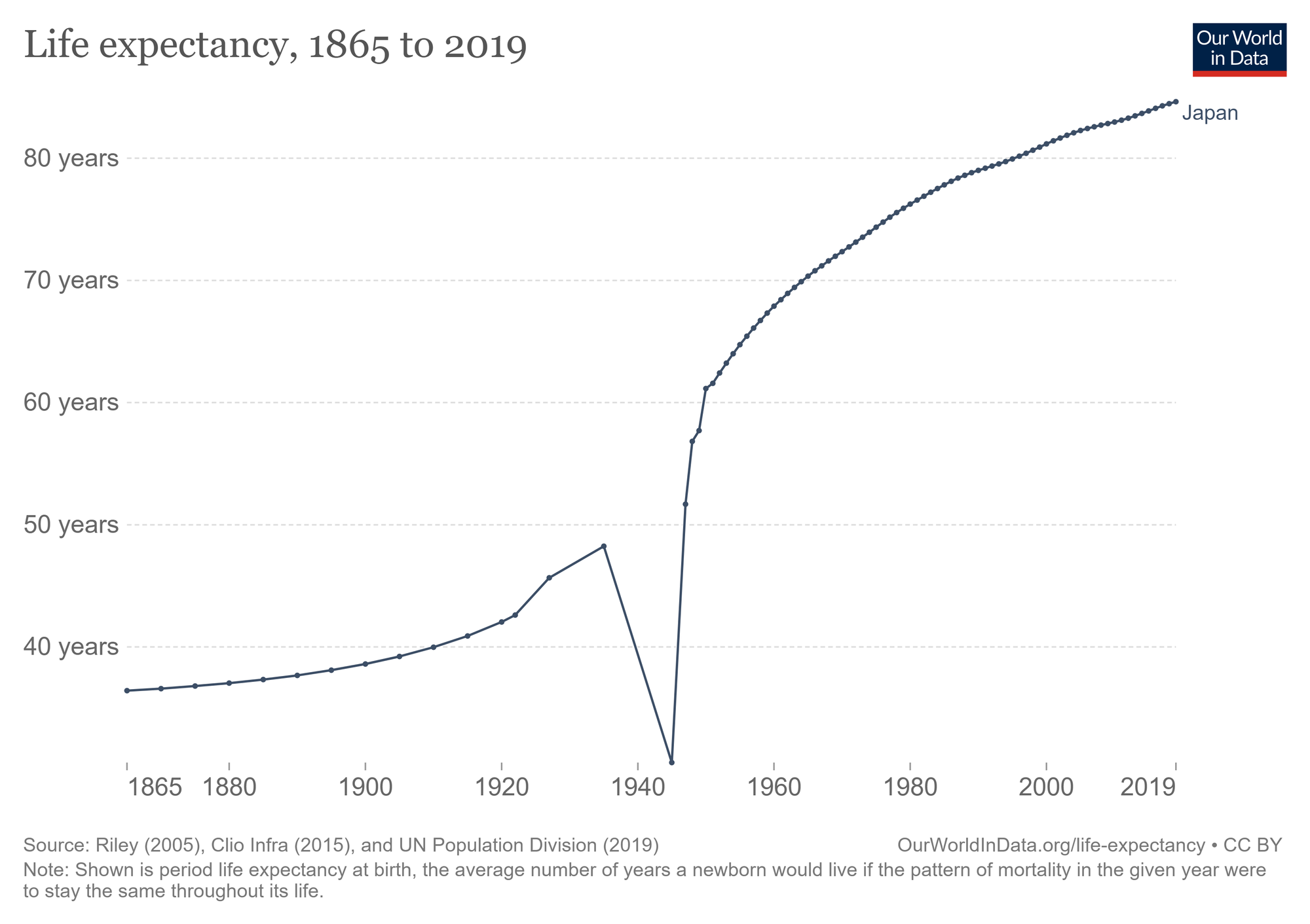 In the early 1800s, there was not a country on Earth with a life expectancy over forty years.[4] The implementation of new knowledge and technologies began to change this.[5] For someone born in Japan in 1880, the life expectancy was 37 years; in 1950, it was 61.2; in 2000, it was 81.2; in 2019, it was 84.6.[6]